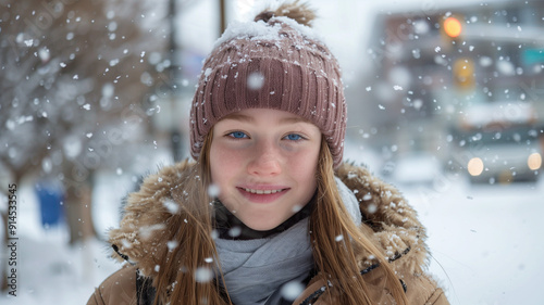 A young Caucasian girl in winter fashion smiling brightly against a snowy urban backdrop