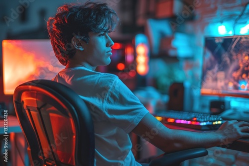A young Caucasian male sits in a gaming chair, focused on his colorful RGB setup in a cozy, low-light room.