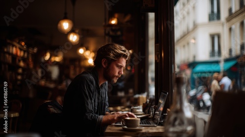 man, caucasian, young, blond, laptop, coffee, hot drink, work, street, urban, interior, lighting, casual attire, sharpened, technology, lifestyle, relaxation, cafes, workspace, modern, city, european, sitting, table, bistro, design, people, business, communication, social, networking, study, concentration, beverage, eatery, creative, environment, leisure, activity, daytime, indoor, vintage, decor, atmosphere, relaxed, scene