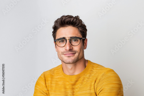 a young Caucasian teen in neat attire on a white gray background captures a blend of professionalism and casual confidence.