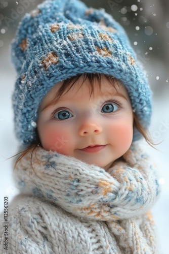 A young child wearing a warm knitted hat and matching scarf, perfect for winter scenes or family photography