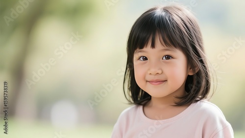 A young child with a gentle smile, wearing a light pink top, set against a soft-focused outdoor background.