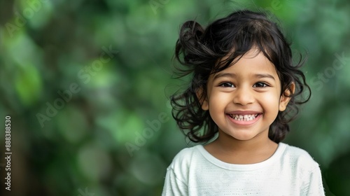 A young child with curly hair and a bright smile stands against a natural green background, exuding joy and innocence.