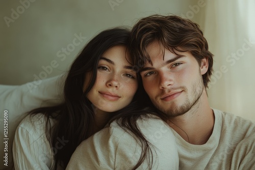 couple, love, affection, intimacy, romance, human relationships, young, young couple, togetherness, tenderness, close, cuddling, hugs, portrait, face, man, woman, girl, boy, boyfriend, girlfriend, happy, smiling, serene, calm, peaceful, relaxed, natural, casual attire, candid, home, indoor, soft light, beige, closeup, connection