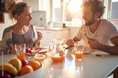couple, spouse, kitchen, household, guy, girl, valentine, eating, meal, breakfast, morning, human relationships, enjoying, together, love, lovely, cute, sitting, drink, juice, fruit, food, home, vegetable, table, young, photogenic, domestic, modern, casual attire, adult, indoor, caucasian, relaxing, pleasant, house, quarantine, isolation, man, woman, happy, apartment, happiness, joy, male, female, smiling, chatting, talking, pleasure