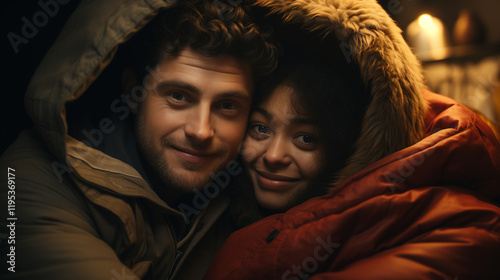 young couple, lover, winter, hugs, cold, february 14, romance, winter clothes, plaid, love, intimacy, style, warmth, comfort, happiness, closeup, human relationships, together, young, people, walk, emotion, youth, feeling, meeting, holiday, night, face, hair, smiling, studio, person, model, black, woman, beauty, fashion, hood, couple, smile, lady, family, eye, dark