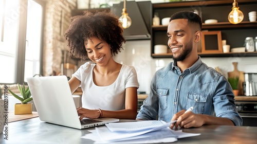 a young couple seated together at a kitchen table, their radiant smiles illuminating the room as they joyfully review documents on a laptop.