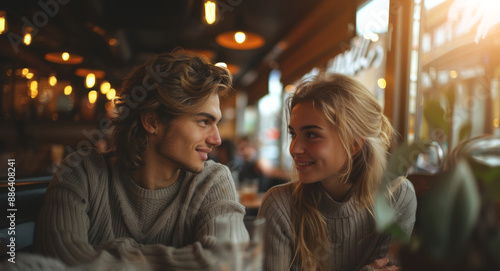 ai, autumn, couple, cafes, eatery, romantic, date, love, hot drink, tea, drink, evening, night, light, conversation, intimacy, happiness, smiling, man, woman, young, casual attire, cosy, warm, atmosphere, indoor, lighting, table, chair, interior, city, urban, lifestyle, connection, dating, human relationships, affection, together, joy, laughter, relaxed, comfortable, wear, soft, natural, out, fun, life, people