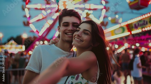 A young couple smiles at a carnival with a Ferris wheel in the background. The man rests his hand on the woman's shoulder, both in white shirts, evoking a happy, romantic mood.