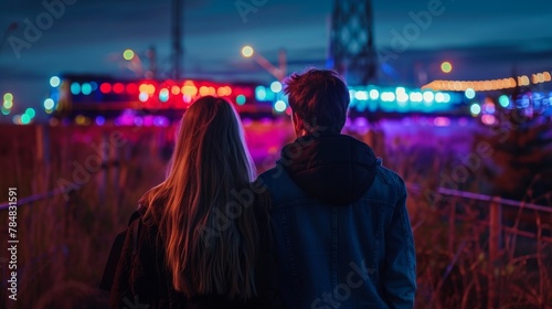 A young couple stands side by side gazing at the glowing train in the distance. backs are to the camera but its clear that they . .