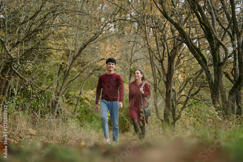 A young couple walking along a leafy forest trail in autumn, a candid scene highlighting authentic connection and genuine emotions, capturing natural everyday lifestyle and believable interaction.