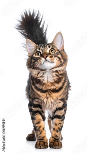 A young, curious cat with brown tabby markings and a fluffy black tail looks upward