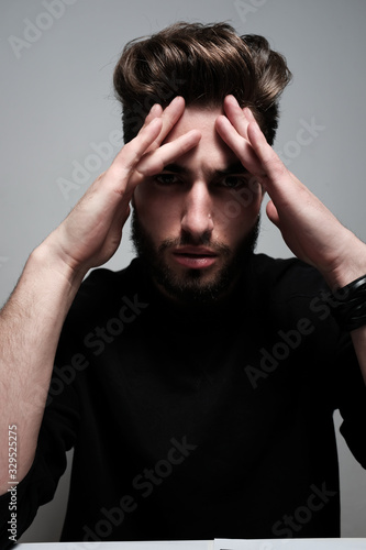 A young dark-haired man with a beard holds his head and shows different human emotions: hatred, fear, despair, horror, malaise, headache, clairvoyance. Close-up studio portrait of a man.