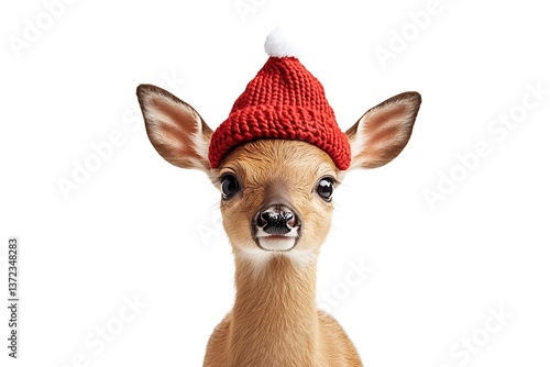cervid, fawn, animal, mammal, wildlife, head, eye, ear, nose, mouth, fur, soft, cute, adorable, gentle, brown, tan, red, hat, winter, holiday, knitted, pom-pom, festive, close, up, portrait, isolated, white, background, innocent, curious, gaze, charming, delightful, beautiful, young, small, baby, warm, cosy, funny, season, celebration, cheerful, friendly, delicate, calm