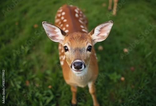 A young deer with large brown eyes and a friendly expression, standing in a grassy field