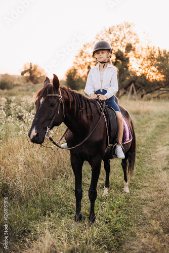 A young equestrian girl happily riding a majestic horse against the beautiful sunset backdrop