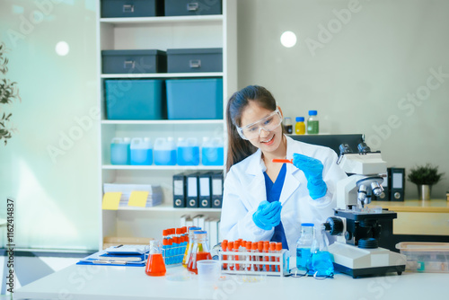 A young female scientist, wearing a lab coat,safety glasses, gloves, examines a test tube containing a lab solution with a microscope,working on a science experiment involving liquid and chemicals