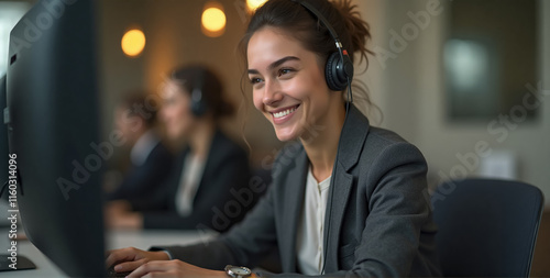 A young, friendly female operator is depicted working diligently in a professional call center environment.