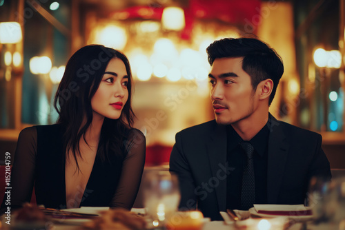 A young girl and an Asian man on a date. A beautiful, loving couple is sitting next to each other in a restaurant. Valentine's Day concept. Love.