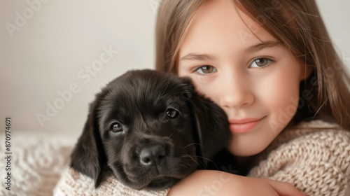 girl, children, puppy, black, dog, labrador, cuddle, hug, hugs, pet, animal, love, affection, happiness, smile, young, cute, adorable, sweet, friendship, loyal, companion, furry, friends, canino, playful, innocent, close, tender, warm, care, joy, home, indoor, portrait, closeup, face, eye, brown hair, white background, companionship, pet