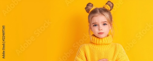 A young girl in a cozy yellow sweater poses against a bright yellow background, showcasing her playful hairstyle and thoughtful expression.