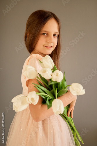 A young girl in a light pink dress stands confidently, holding a bouquet of fresh white tulips. The neutral background enhances her graceful pose and cheerful expression