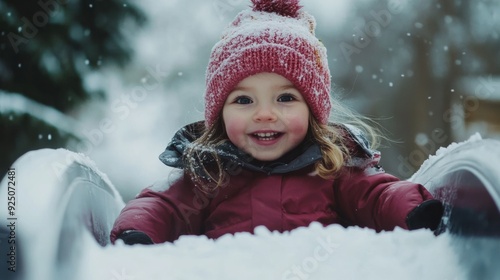 young, girl, red, hat, jacket, sliding, hill, smiling, winter, outdoors, children, cheerful, cute, snow, happiness, 1, person, childhood, caucasian, fun, joy, nature, girl, lifestyle, portrait, season, playing, small, warm, clothing, cap, beauty, forest, playful, baby, children, sled, preschool, age, laughing, vacation, enjoyment, family, looking, snowflake, day, female