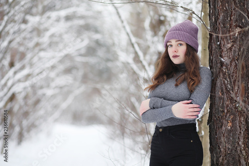 A young girl in a winter park on a walk. Christmas holidays in the winter forest. The girl enjoys winter in the park.