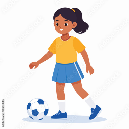 girl, children, children, young, soccer, football, sport, player, activity, playing, happy, smiling, sporty, active, exercise, motion, ball, football, uniform, yellow, blue, dress, short, attire, activewear, standing, ready, kicking, movement, enjoyment, fun, children, illustration, cartoon, graphic, design, character
