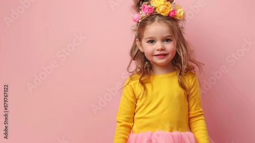 girl, young, children, smile, happy, dress, yellow, pink, tulle, skirt, flower, crown, floral, headband, accessory, fashion, portrait, studio, background, wall, innocence, childhood, joy, playful, cute, adorable, sweet, pretty, beautiful, cheerful, bright, light, colours, vibrant, little girl, children, children, female, model, smiling girl