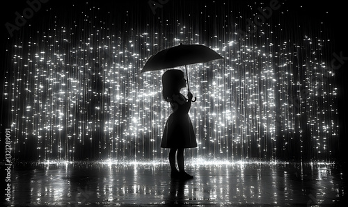 girl, children, umbrella, rain, shower, sparkle, glistering, light, dark, black, white, monochrome, silhouette, scene, image, photo, photo, picture, art, artwork, design, graphic, digital, background, floor, shine, bright, night, dreamy, magical, mysterious, serene, peaceful, calm, quiet, alone, solitary, innocence, childhood, pure, beauty, elegance, simple, minimal, abstract, mood, feeling