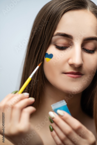 A young girl with beautiful skin draws a heart from the colors of the Ukrainian flag, no war