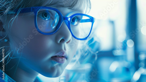 A young girl with blue glasses stares in contemplation, her face bathed in the cool blue light of a lab, embodying curiosity and thought.