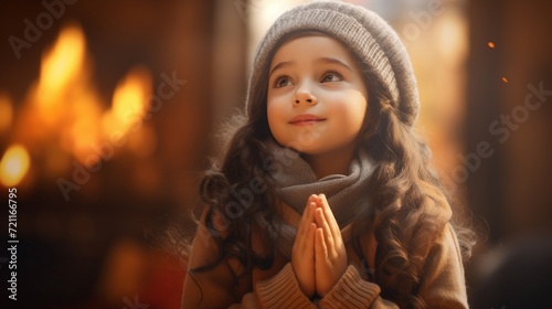 A young girl with hands clasped in prayer, looking hopeful beside a warm fireplace.
