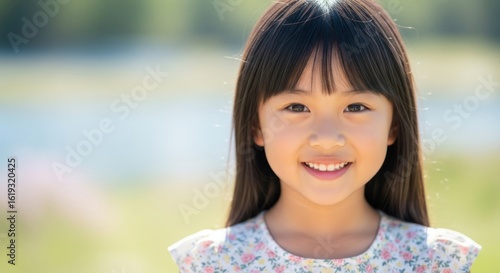 A young girl with long black hair smiling outdoors.