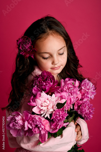 A young girl with long dark hair holds a vibrant bouquet of pink flowers against a bright pink background, exuding a sense of joy and innocence.