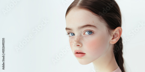 A young girl with striking blue eyes brown eyebrows and a braided hairstyle gazes intensely against a soft neutral background in natural light, child model for advertisement