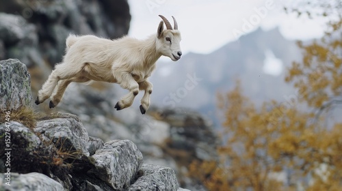 goat, young, jump, leap, mountain, rock, terrain, wildlife, nature, animal, leaping, spring, fluffy, white, cream, brown, horn, outdoors, adventure, rocky, climb, scenic, autumn, fall, foliage, landscape, mountainous, mammal, herbivore, free, agile, active, freedom, high-coloured, dramatic, detail, motion, environment, wild, powerful, untamed