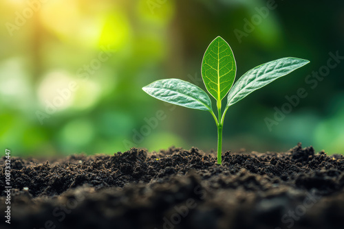 A young green plant emerging from rich soil, symbolizing growth and renewal in a vibrant natural setting with soft sunlight in the background.