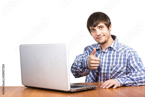 A young guy is working behind a laptop showing a hand like a white background on a white background