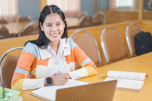 A young happy woman Asian college student in student uniform studying online, reading a book, using digital tablet or laptop in university library in free time by oneself