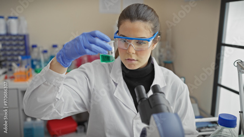 A young hispanic woman examines a vial in a laboratory, showcasing her role in scientific research and healthcare.