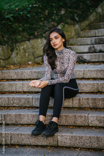 A young Indian Asian woman is sitting on some steps in the park during the evening. She is beautiful, attractive, athletic and tall and is wearing fitting clothes including a snakeskin top.