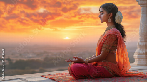 A young Indian girl practicing yoga in a vibrant sari on a temple terrace at sunrise, the colorful sky enhancing the peaceful mood