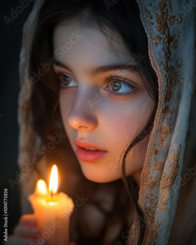 A young Jewish girl softly illuminated by the flickering flame as she lights candles before Yom Kippur, captured in a warm, intimate medium shot.