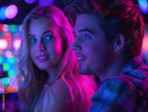 A young man and woman in a vibrant, neon-lit environment, seemingly enjoying a lively atmosphere filled with colorful lights.