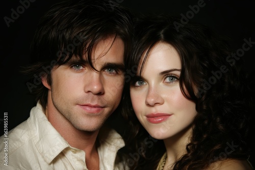 A young man and woman with dark hair pose closely together, looking directly at the camera with soft expressions and a dark background
