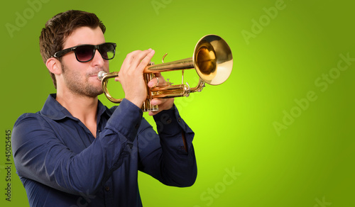 adult, attractive, background, blowing, brass, casual attire, caucasian, charming, copy space, entertainer, entertainment, equipment, green, guy, hold, instrument, isolated, jazz, lifestyle, male, man, mouthpiece, music, musical, musician, 1, optical, optic, people, person, protection, protective, rythm, shade, shiny, single, racked, studio, sunglasses, trumpet, trumpeter, tubing, tuning, young, youth