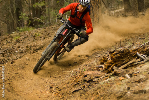 A young man downhill mountain biking on Mount Elden near Flagstaff, Arizona.