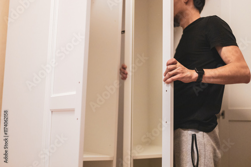 young, man, door, holding, side, wall, board, part, clothes rack, screwdriver, colours, body, detail, cupboard, series, concept, assembly, furniture, modern, lifestyle, home, professional, service, small, business, technology, beige, room, design, scandinavian, hand, construction, installation, wooden, repair, handyman, male, cabinet, men at work, carpenter's shop, indoor, mirror, repairman, object, bricolage, poster, banner, people